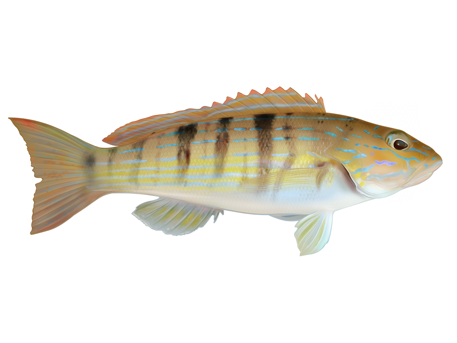 Lane Snapper: A beautiful fish with pinkish-red stripes, lane snapper are another reef favorite. They put up a good fight for their size and are delicious on the grill. These guys tend to school up, so when you catch one, there's usually more where that came from.